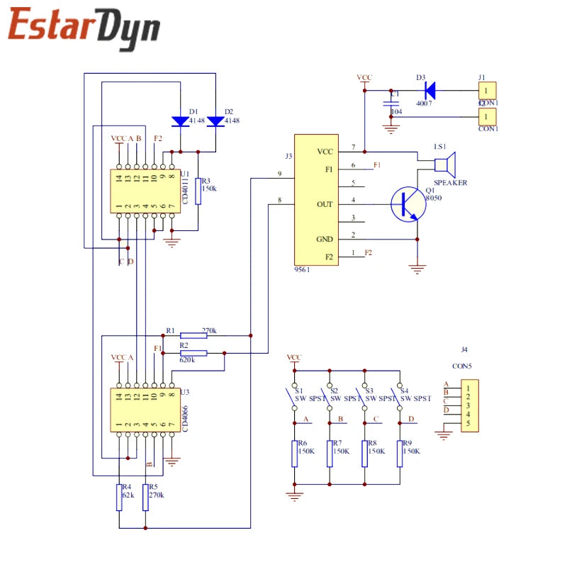 3. The additional control circuit, using the four states of two binary digital resistor R1, R2, R4, R5 produce a combination of four different to change 9561 external vibration resistance value, which changes the oscillation parameters, the change of the oscillation parameters, is not only changed the oscillation frequency, and derive a lot of new sound.