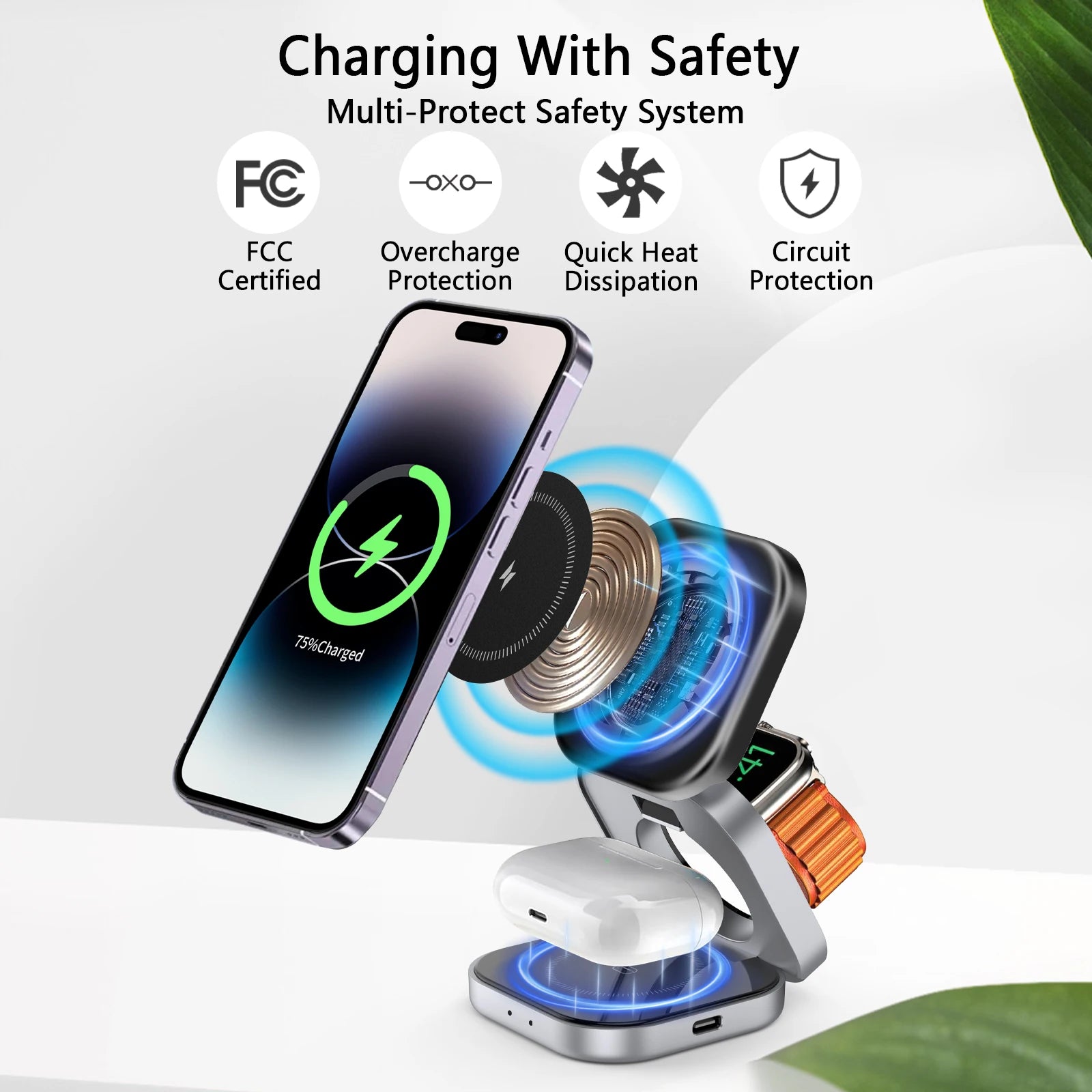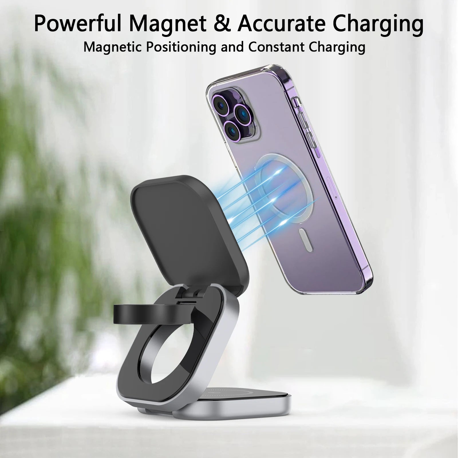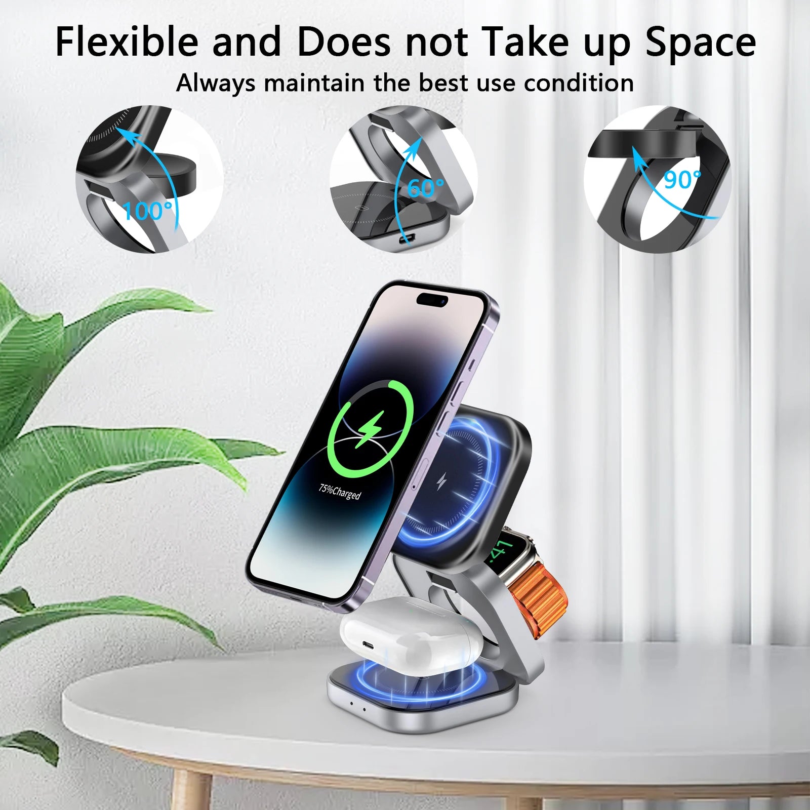 【Foldable Design】Friendly wireless travel charger is with small foldable design, easy to carry. You can easily fold the wireless charging stand to avoid collisions or scratches when traveling. The 3-in-1 wireless charger can also be folded when not in use, saving more space. Its versatility is also suitable for giving as a gift.