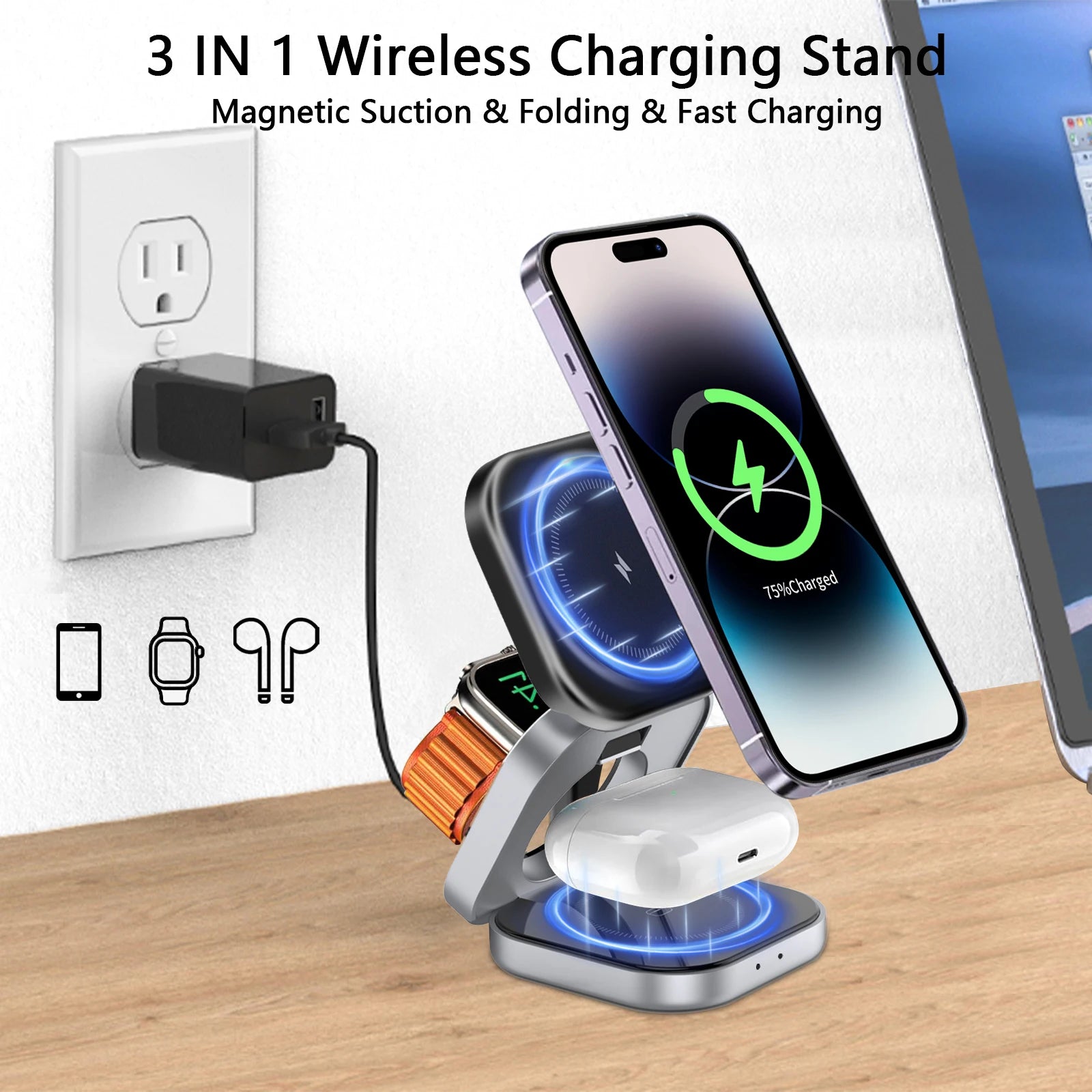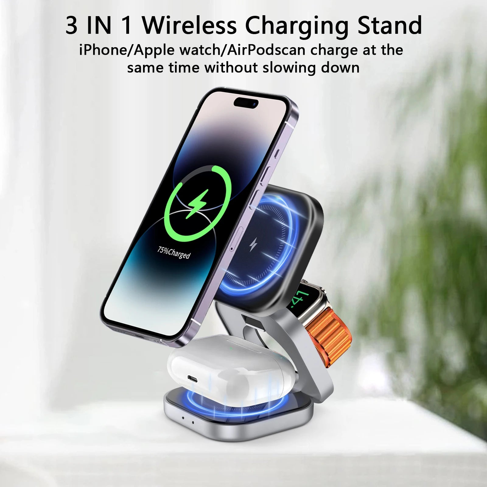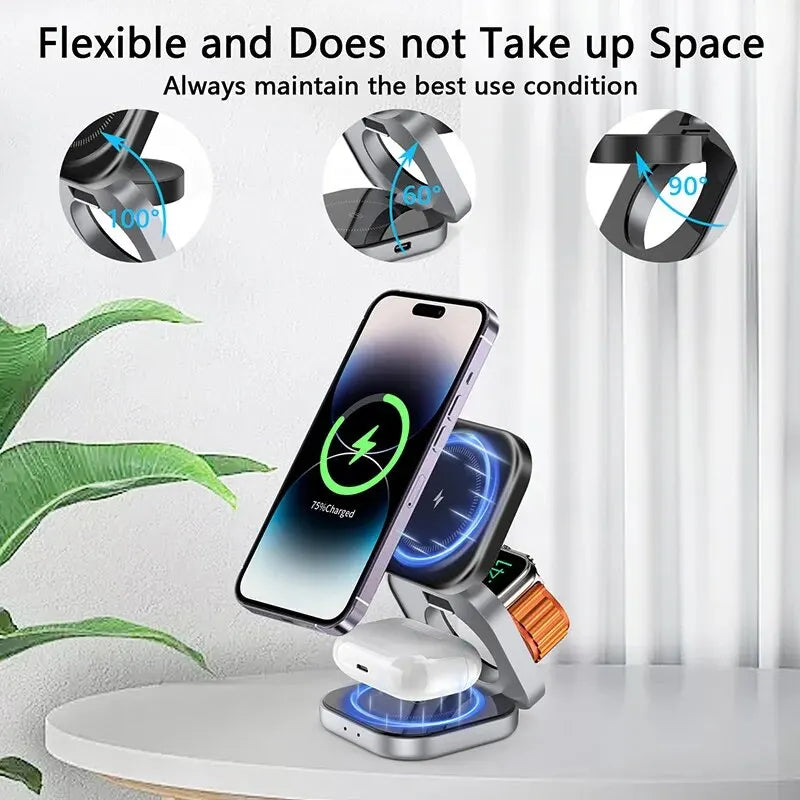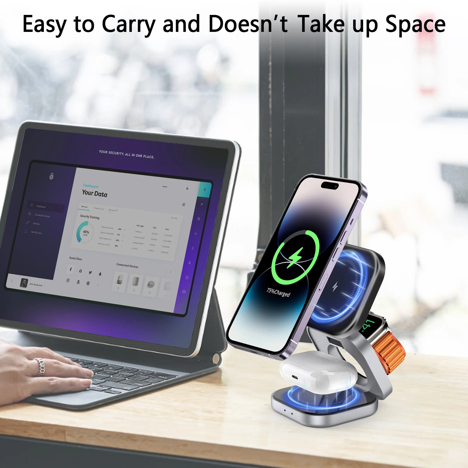 【Foldable Design】Friendly wireless travel charger is with small foldable design, easy to carry. You can easily fold the wireless charging stand to avoid collisions or scratches when traveling. The 3-in-1 wireless charger can also be folded when not in use, saving more space. Its versatility is also suitable for giving as a gift.