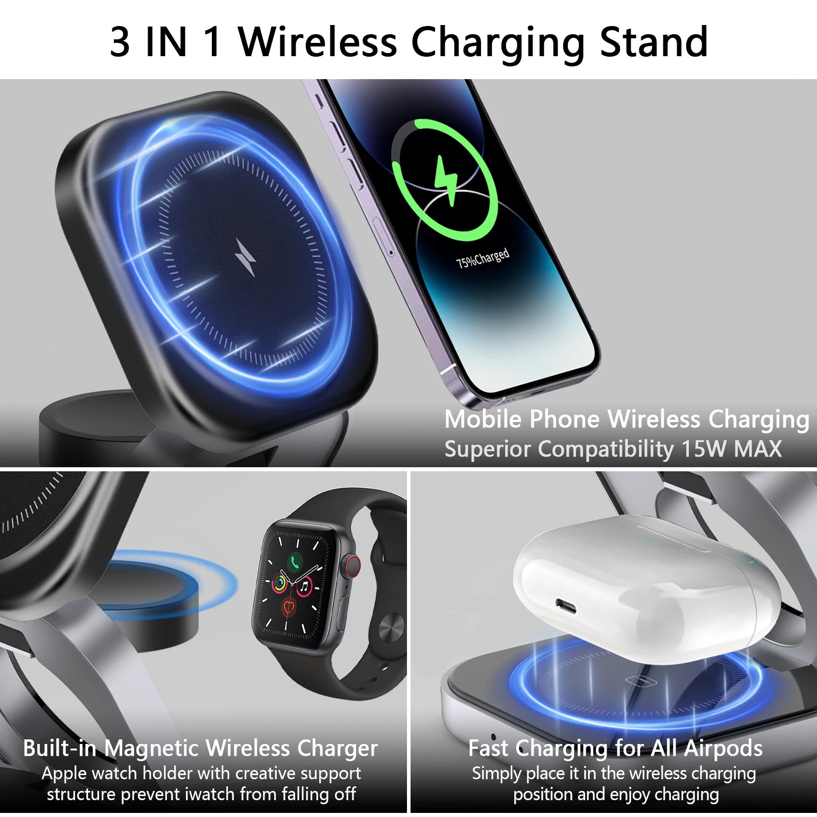 【Charge 3 Devices Simultaneously】Fast wireless charging station for iPhone 15/14/14 Mini/14 Pro/14 Plus/14 Pro Max; 13/13 Mini/13 Pro/13 Pro Max; 12/12 Mini/12 Pro/12 Pro Max; iWatch Series Ultra/SE/8/7/6/5/4/3/2, Air-Pods Pro/3/2. You can charge them at the same time.