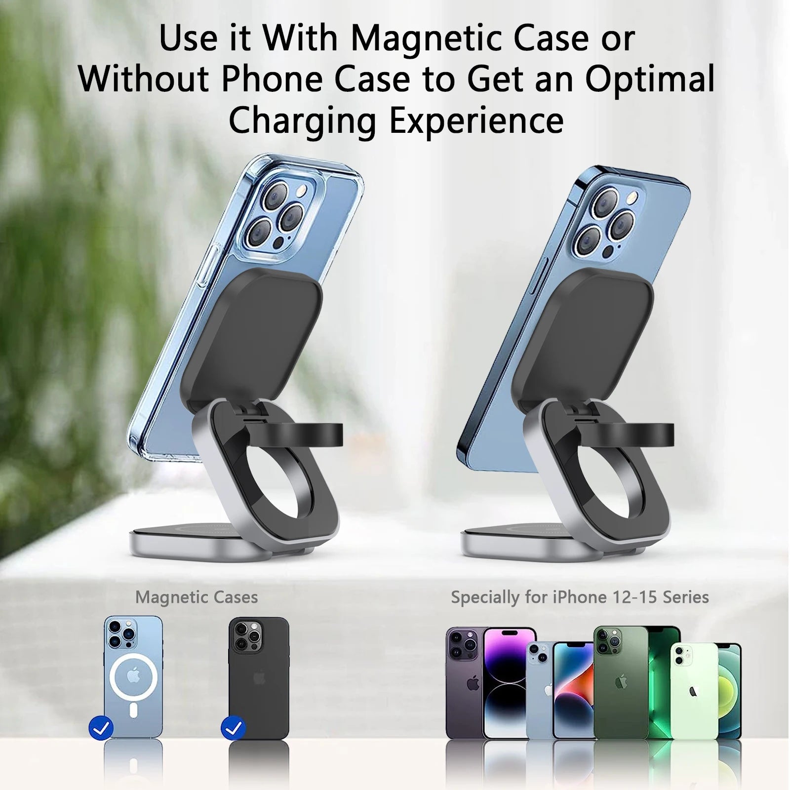 【Magnetic wireless charger】Strong magnetic adsorption makes the iPhone auto-aligning and enters the charging state quickly. It supports iPhone charging vertically or horizontally for better chatting or watching TV, and it can be adjusted in angle for your convenience, free your hands or neck. (Note: Magnetic Absorption Charging is only compatible with Mag-Safe Design.)