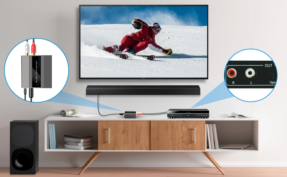 Plug & Play:Easy to install and use, no software, driver required, powered by USB cable (included). Connect simply connect the analogue RCA L/R audio output of your devices (e.g. HDTV, DVD player) with this converter, then optically or coaxially with your digital speaker on the other side.