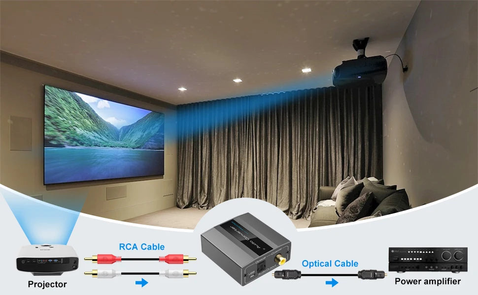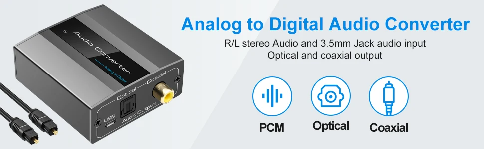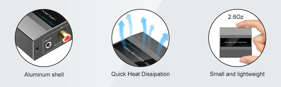 Analogue digital converter audio: analogue to digital audio converter, converts the analogue R/L RCA signal or 3.5 mm jack AUX audio simultaneously into digital coaxial Toslink Spdif optical digital audio. So you can enjoy the sound of your favourite series and movies on a digital stereo system.