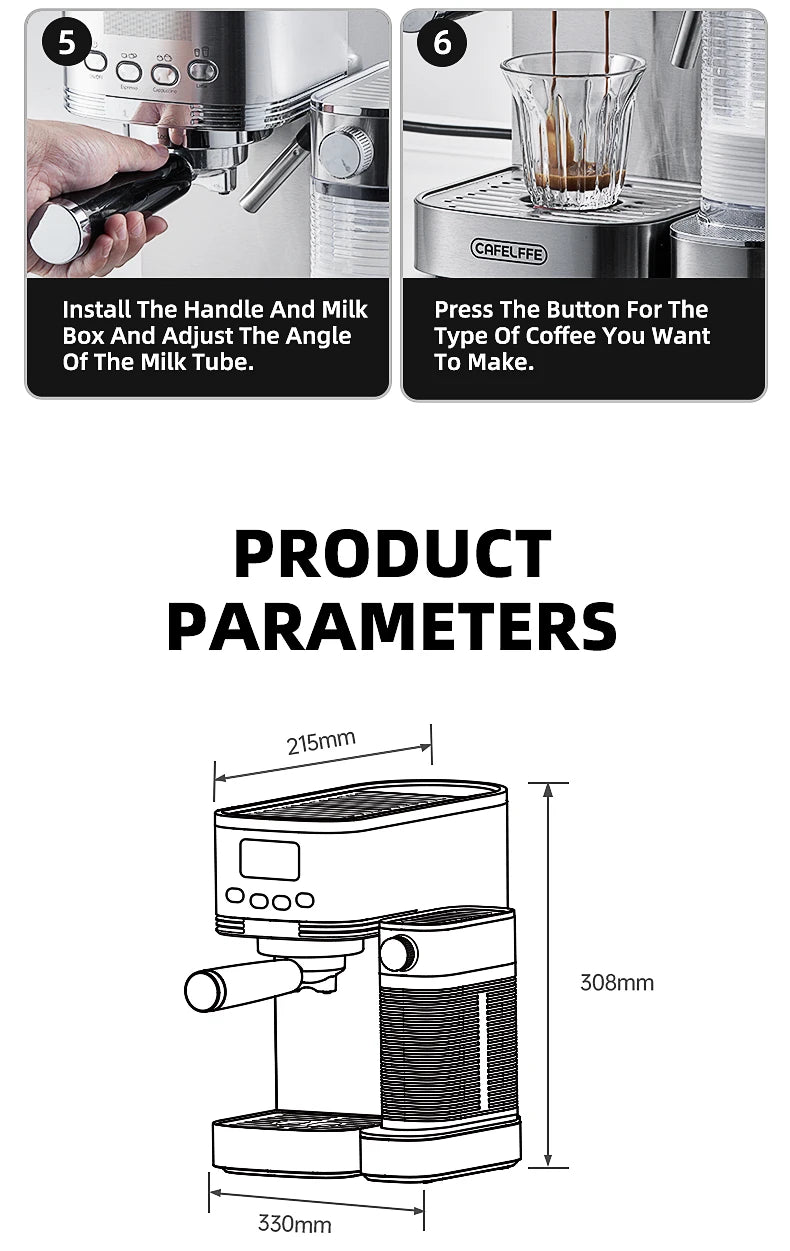 Easy & Multi Functions: One touch operation espresso machine, easily to brew really superior single espresso, double espresso, cappuccino and latte with a simple one press.