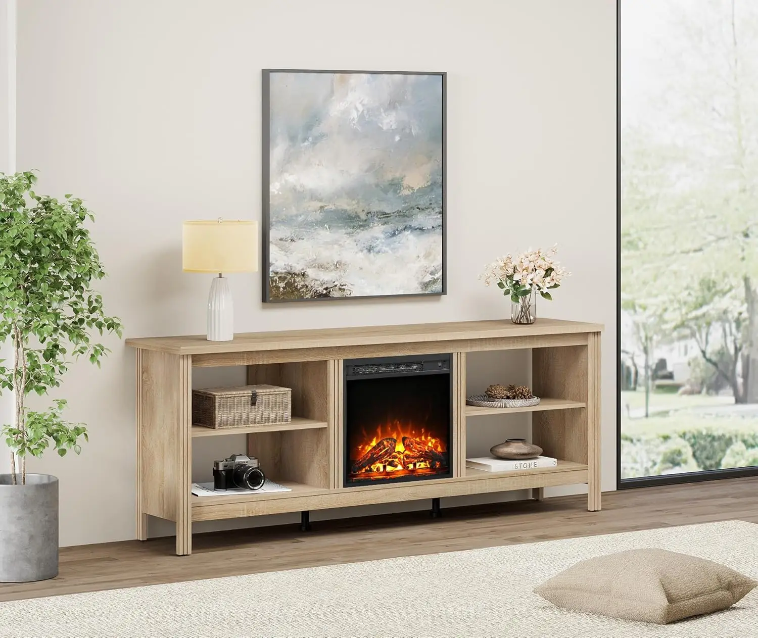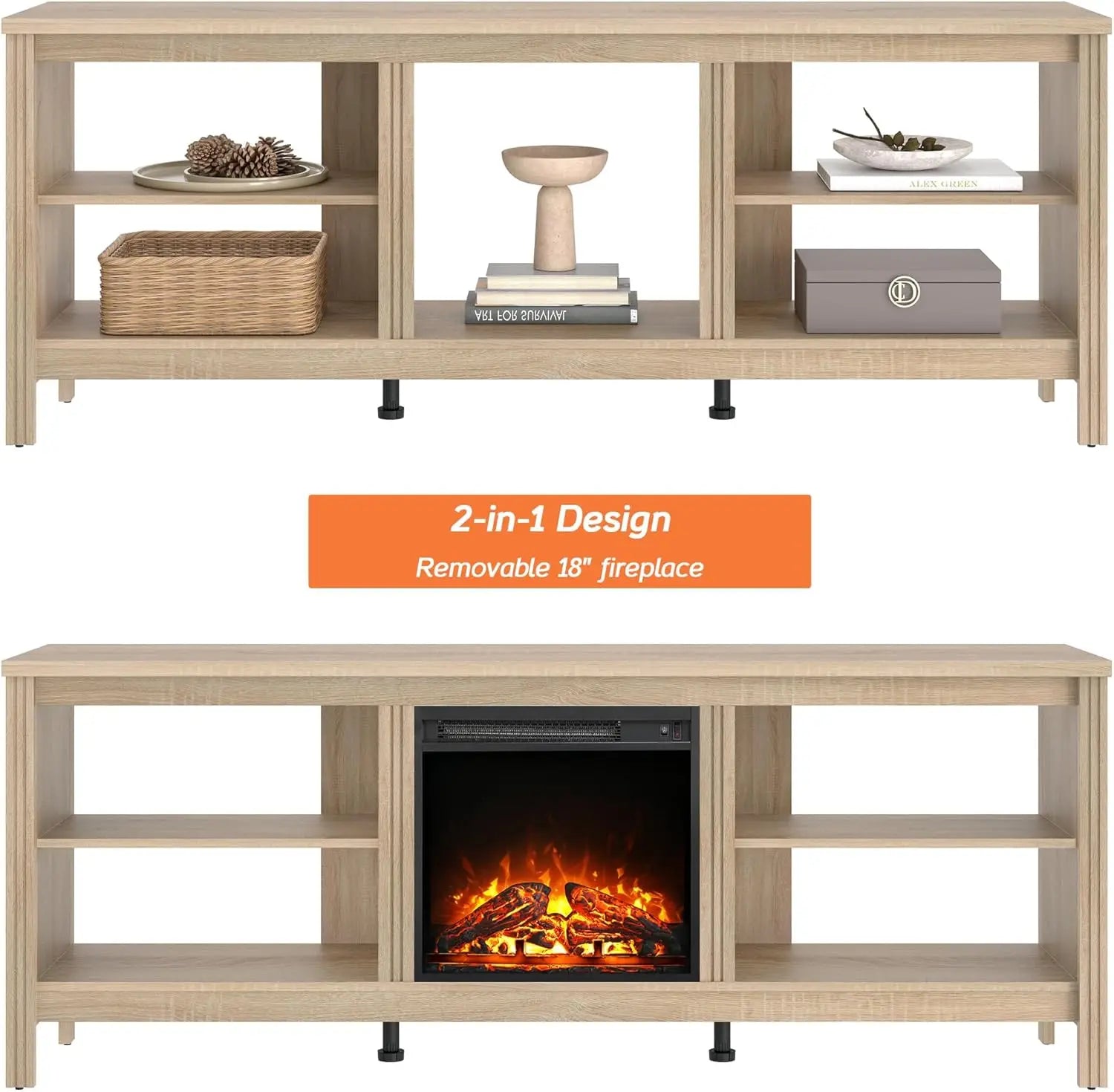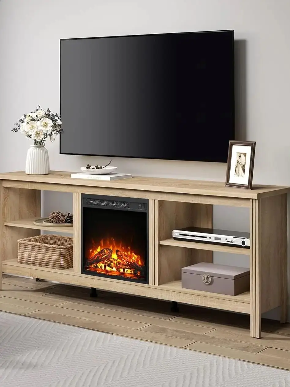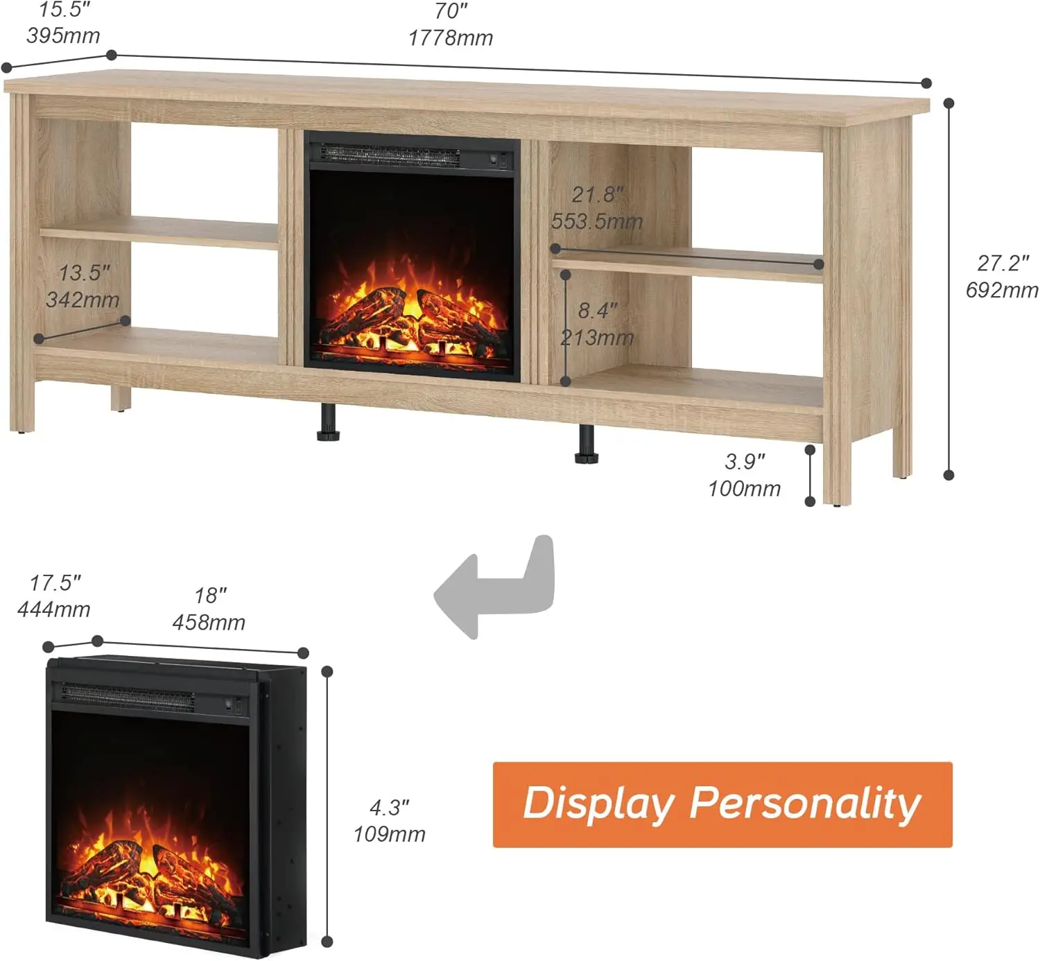【2-IN-1 Multipurpose Design】The oak fireplace TV stand combining 4 storages with electric fireplace can be used WITH or WITHOUT heat.You can put the fireplace in the cabinet to bring warmth to the cold winter and enjoy the 3D realistic flame effect in the summer. With the rustic style, this fireplace entertainment center can greatly upgrade your living space.