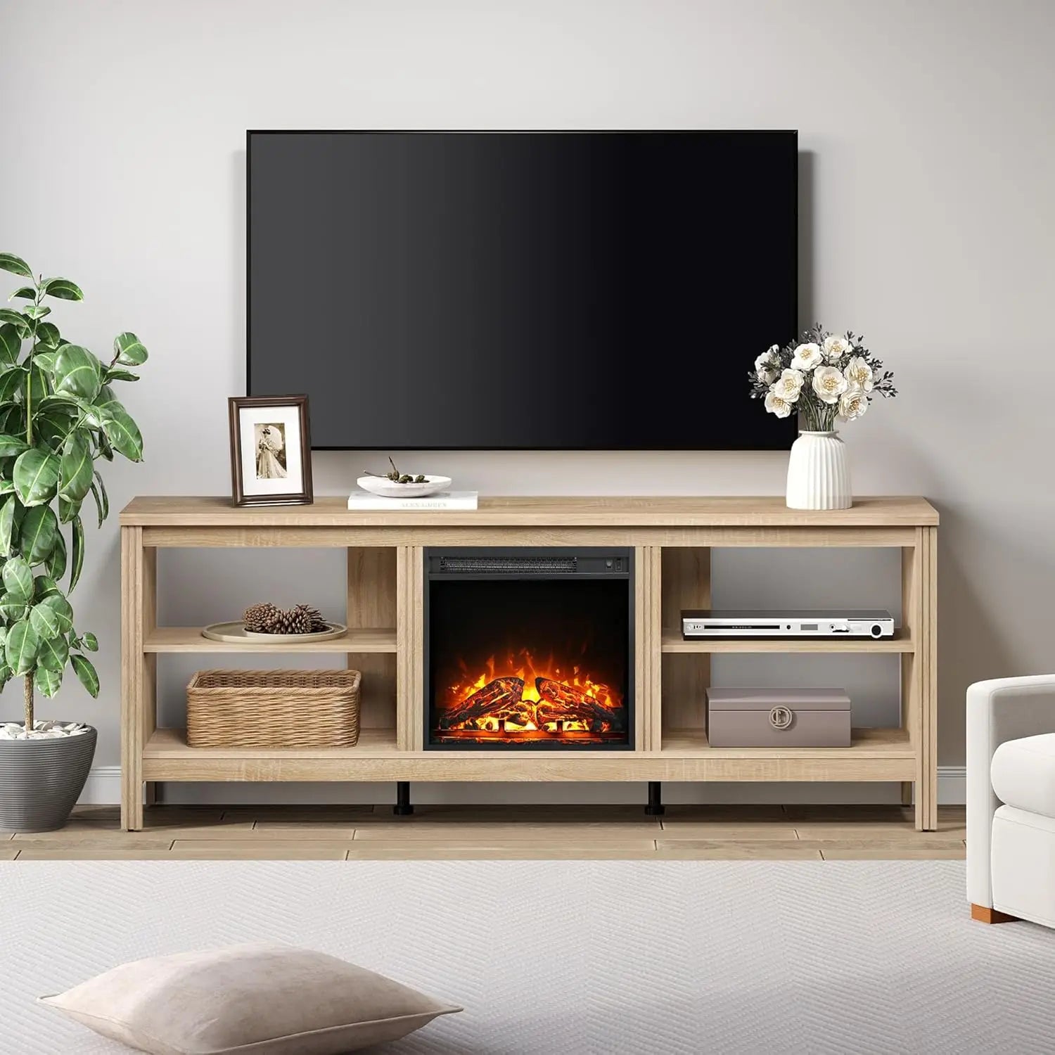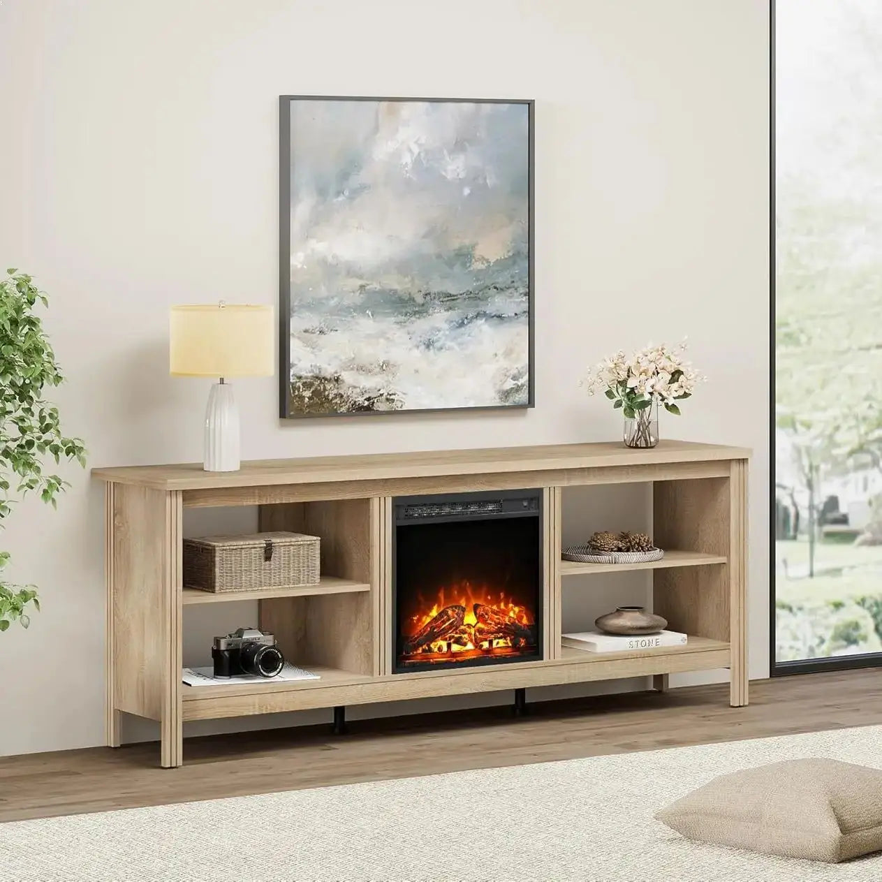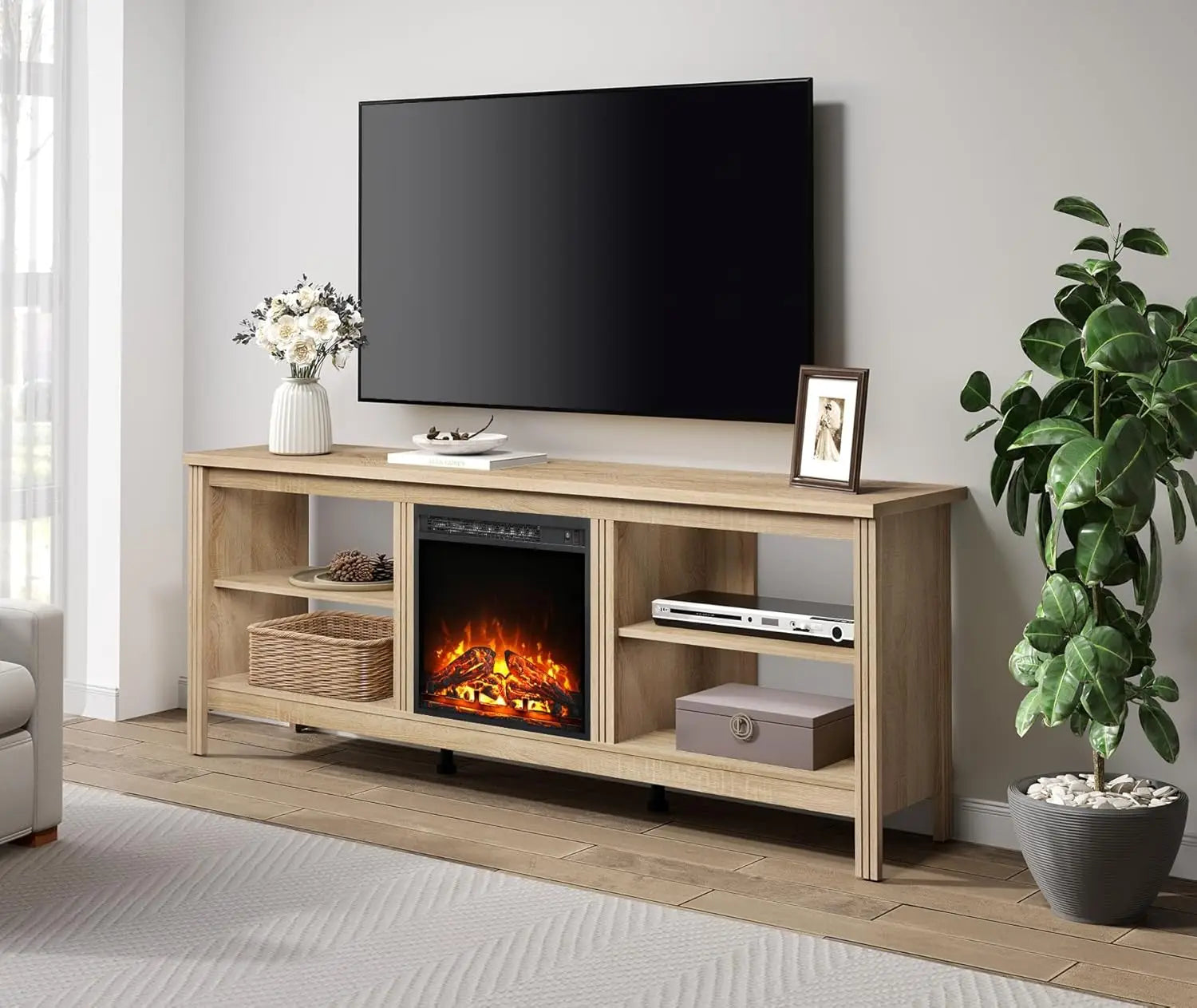 【2-IN-1 Multipurpose Design】The oak fireplace TV stand combining 4 storages with electric fireplace can be used WITH or WITHOUT heat.You can put the fireplace in the cabinet to bring warmth to the cold winter and enjoy the 3D realistic flame effect in the summer. With the rustic style, this fireplace entertainment center can greatly upgrade your living space.