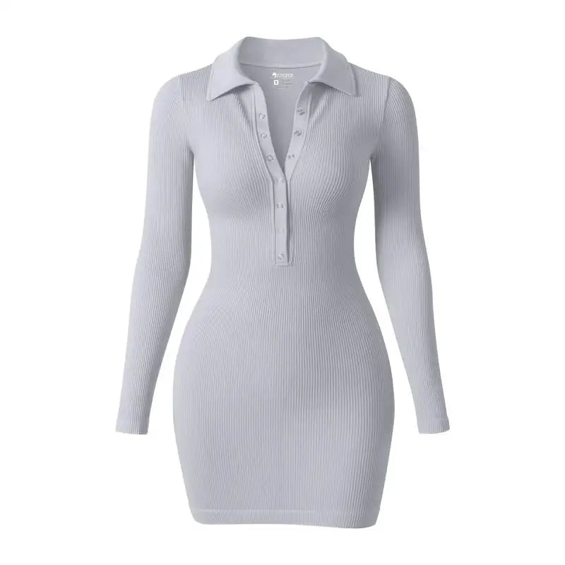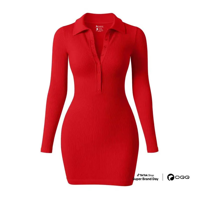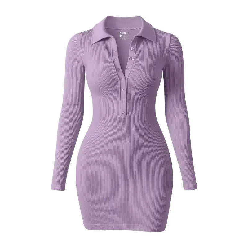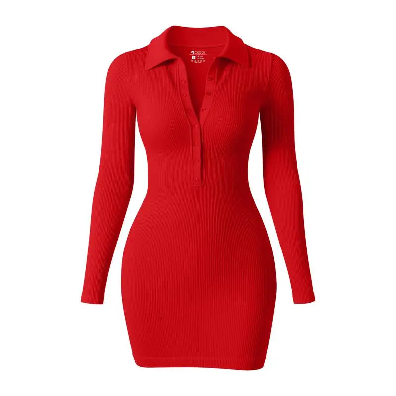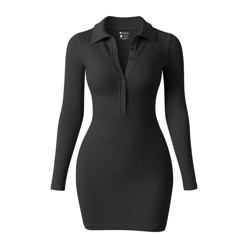 Collar v neck, button front, solid color, pull on long sleeve one piece dress for women and girls.The collar button on the chest is designed to attract more attention.
