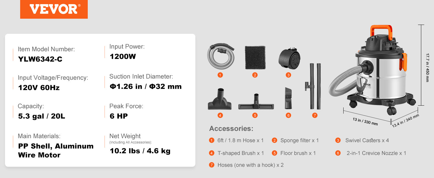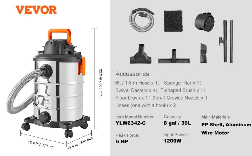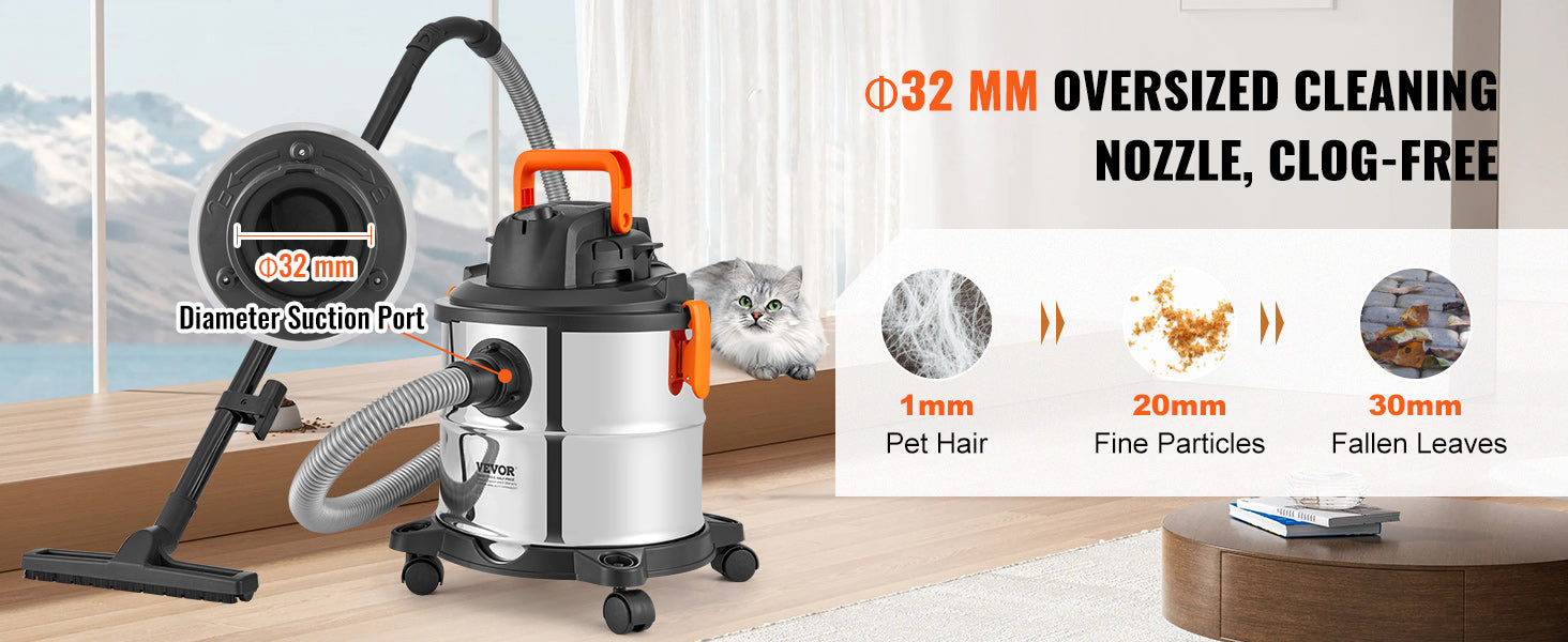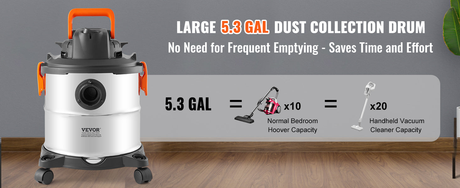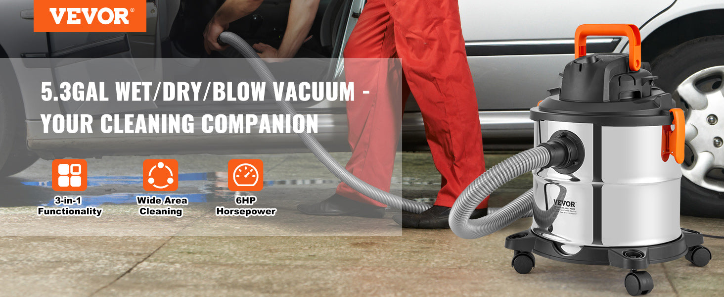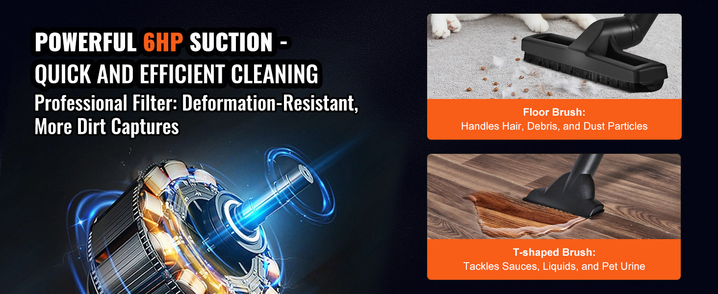 60CFM High Suction Power: Achieve unprecedented cleaning speed with our stainless steel vacuum cleaner boasting 60CFM suction and 6HP peak horsepower. It handles dust, debris, pet hair, and even indoor liquid spills effortlessly.