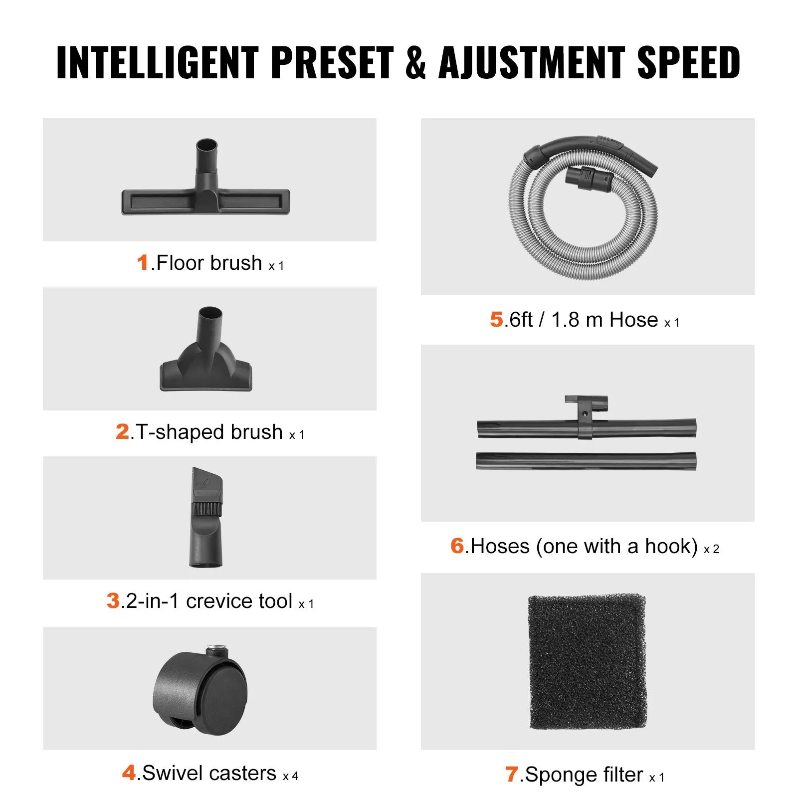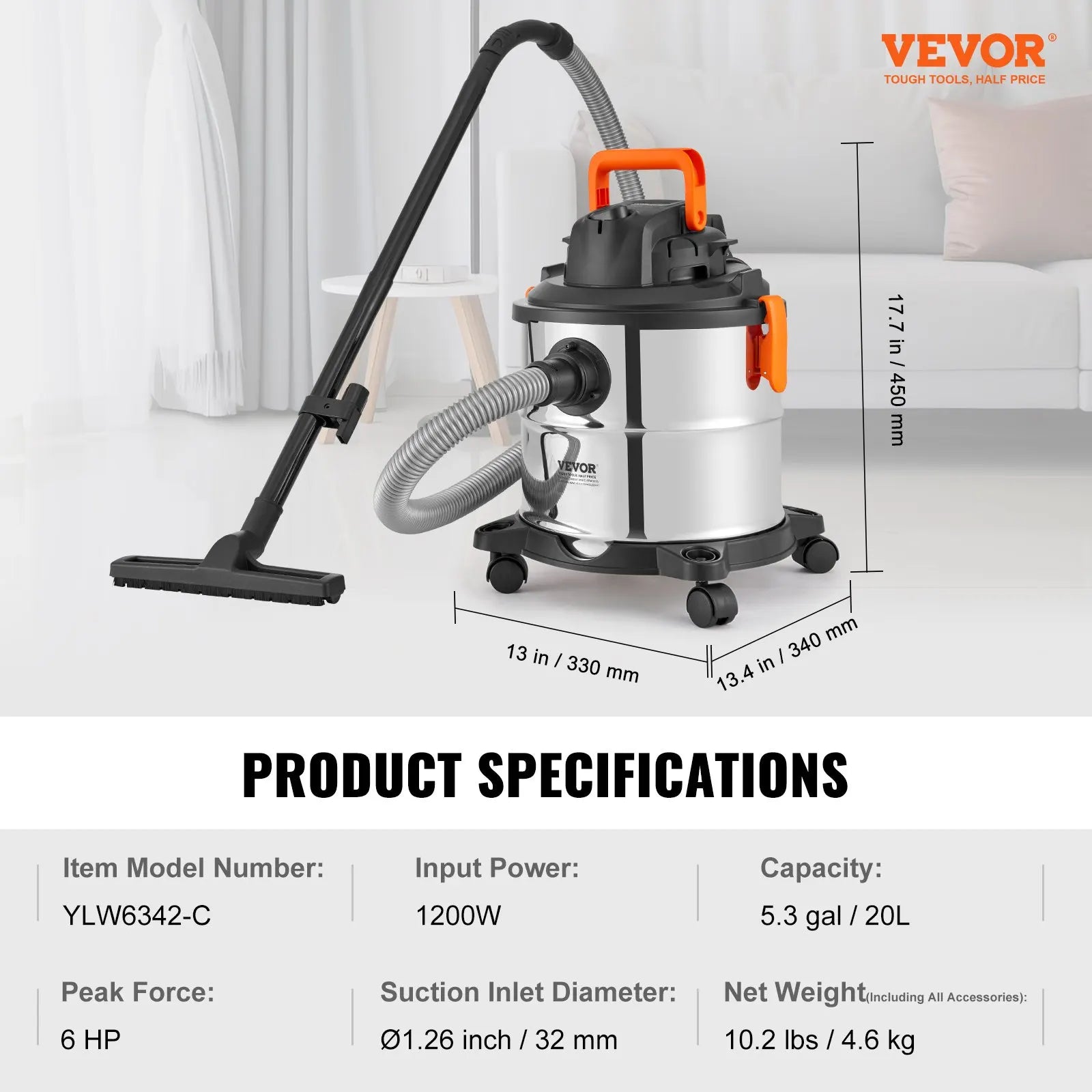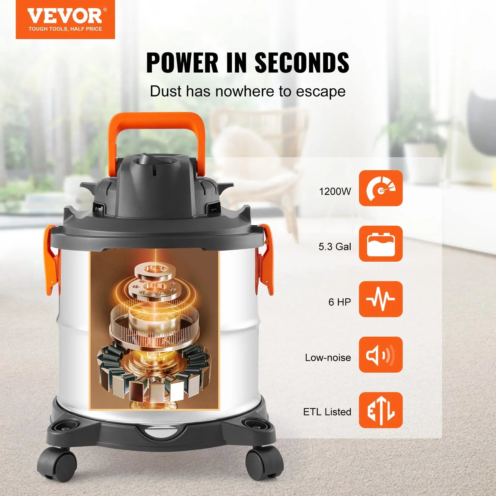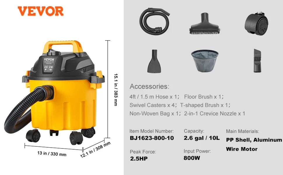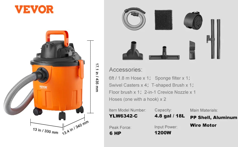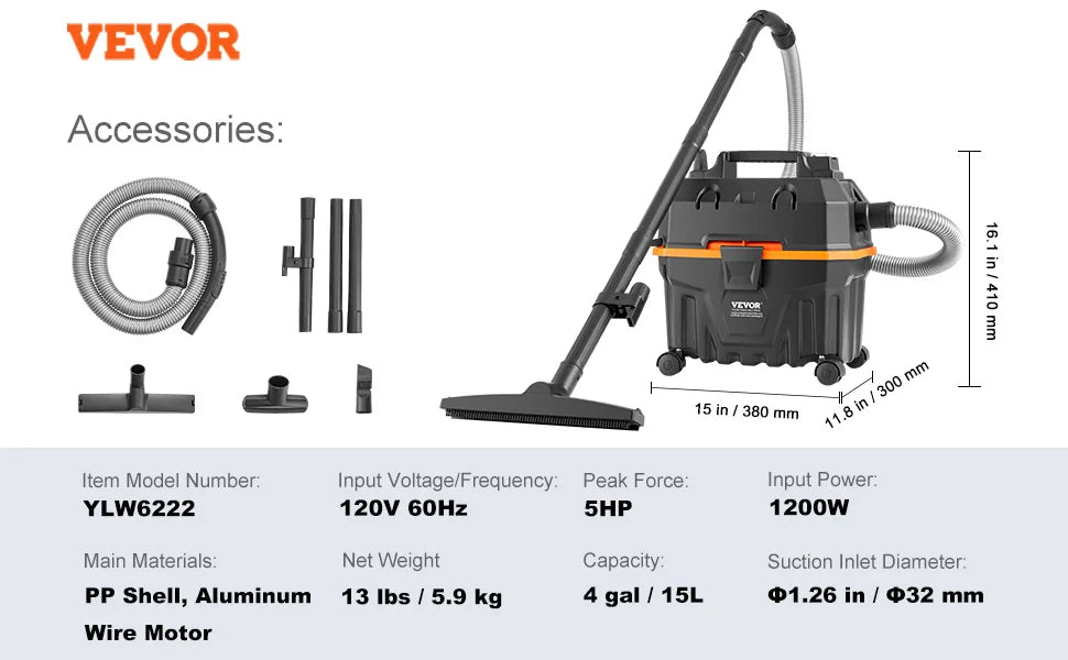 60CFM High Suction Power: Achieve unprecedented cleaning speed with our stainless steel vacuum cleaner boasting 60CFM suction and 6HP peak horsepower. It handles dust, debris, pet hair, and even indoor liquid spills effortlessly.