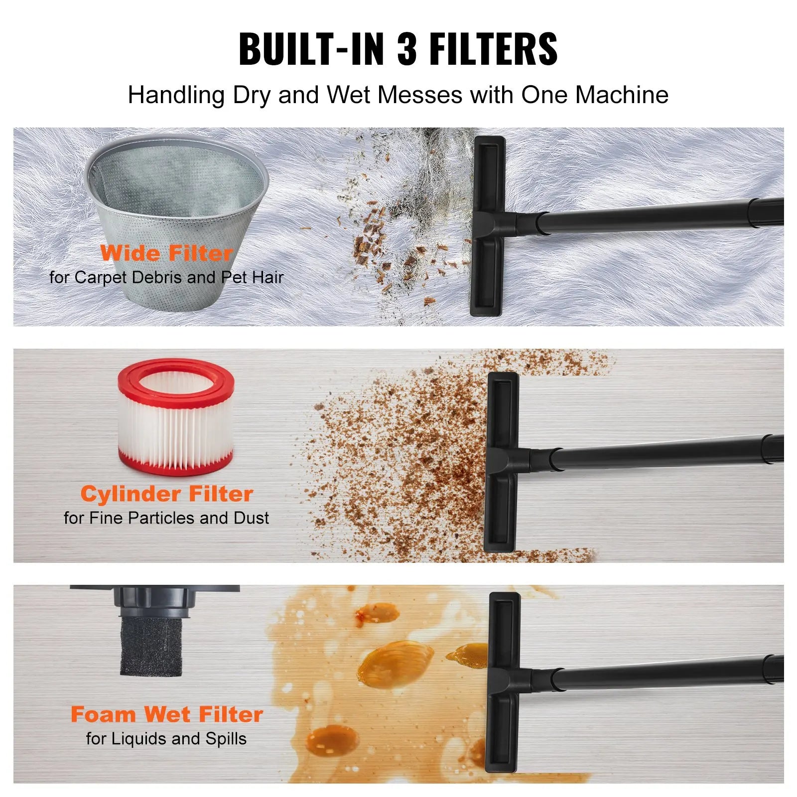 Efficient Filters: Equipped with three types of filters designed for specific cleaning needs, from floors and carpets to fine dust and liquid messes, this vacuum cleaner has you covered.