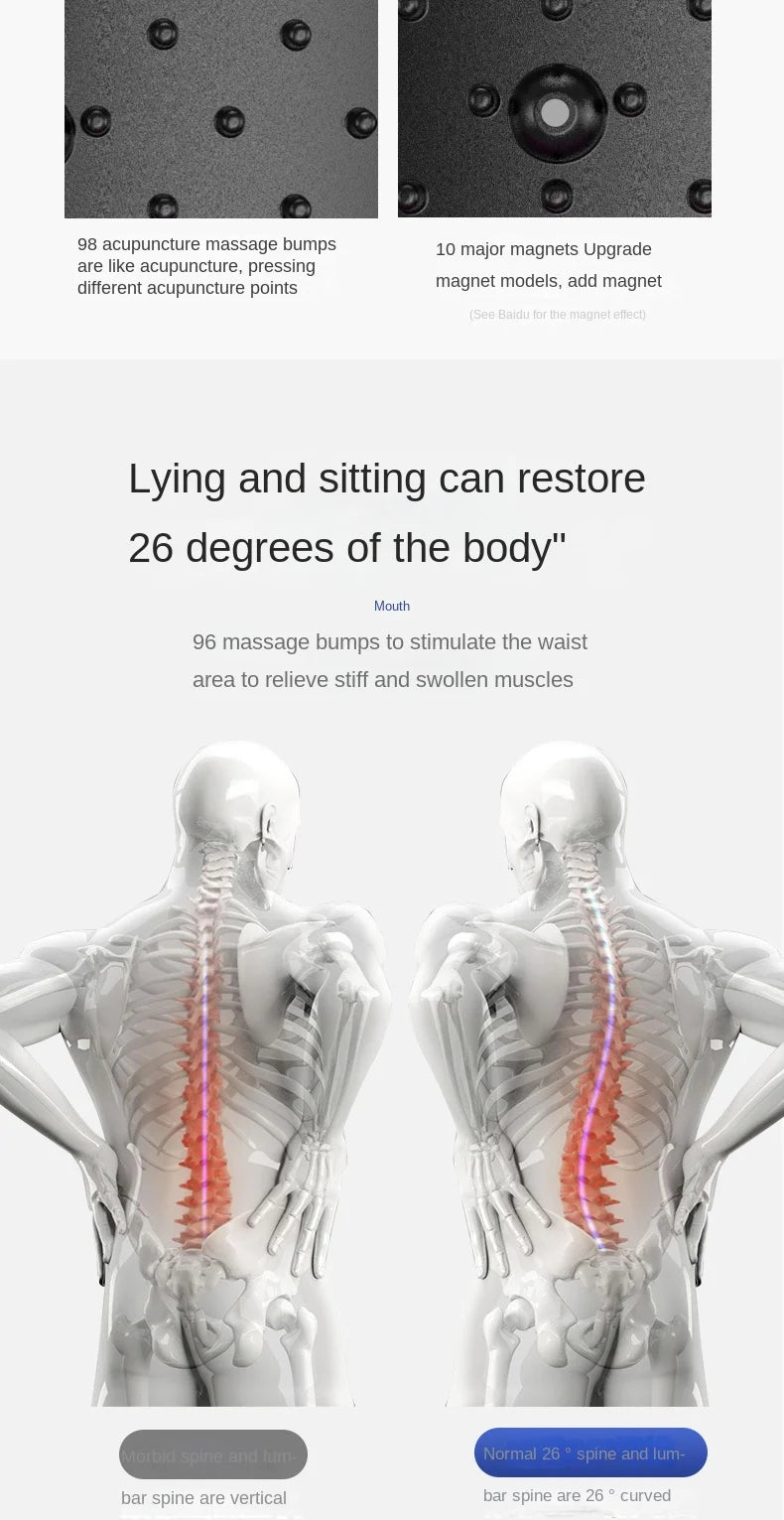 2. Function: Equipped with 88 massage points corresponding to the body acupoints. It can massage the lumbar spine when stretched, and can correct the sitting posture when sitting.